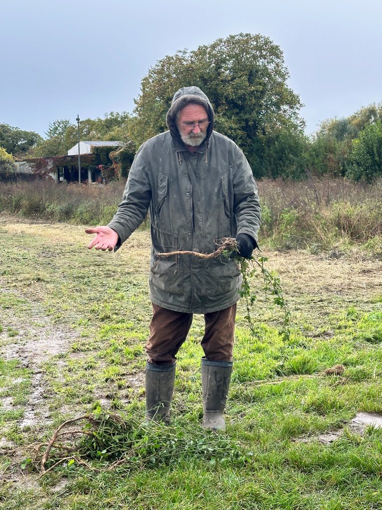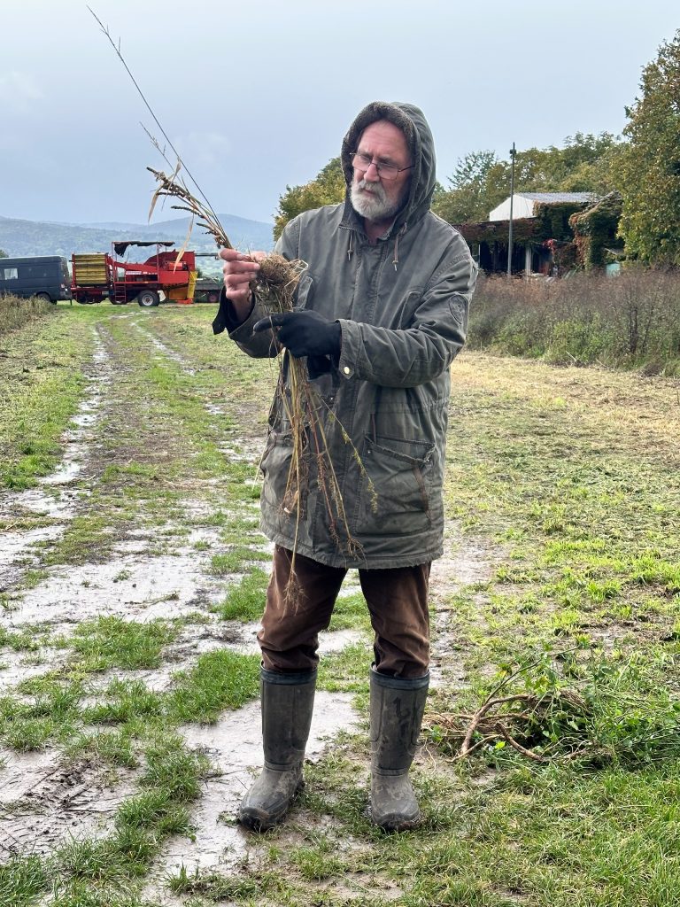 Dann zeigte er uns die dicke Wurzel einer Luzerne. Mit der tiefreichenden Wurzel ist sie nicht nur sehr trockenresistent, sondern auch für die Gründüngung interessant, da das kräftige Wurzelwerk gut für den Humusaufbau des Bodens ist. Darüber hinaus bleiben nach dem Absterben der Pflanze lange Kanäle im Boden zurück, die für eine natürliche Belüftung sorgen (siehe auch den Bericht vom Orga-Treffen vom 09.09.2025).